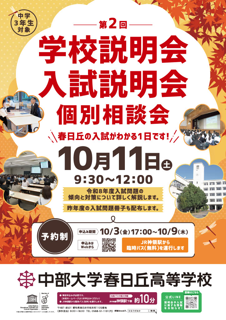 日時:10/11(土)9:30~12:00場所:中部大学春日丘高等学校・令和8年度入試問題の傾向と対策について詳しく解説します。・昨年度の入試問題冊子も配布します。・【個別相談】聞きたいこと、知りたいこと、なんでもご相談ください。・事前申込制となっております。申込み期間 10月3日(金)17時~ 10月9日(木)
