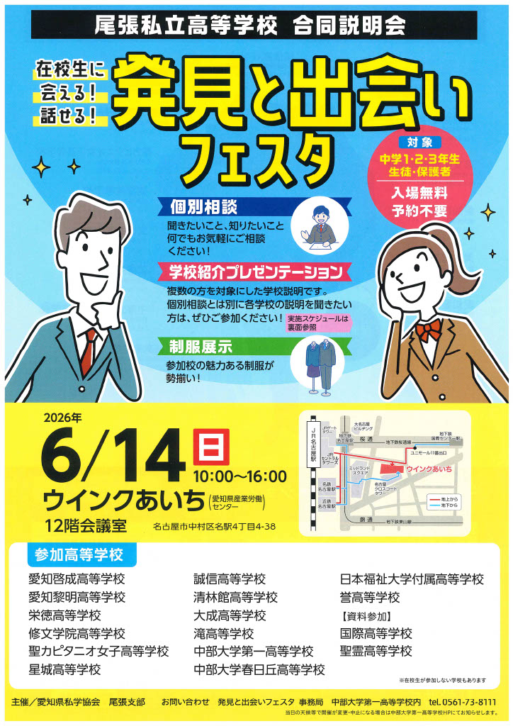 日時:6/14(日)10:00~16:00場所:ウィンクあいち(愛知県産業労働センター)・尾張地区私立高等学校の合同説明会です。中部大学春日丘高校はもちろん、多数の学校が参加します。・「個別相談」聞きたいこと、知りたいこと、何でもお気軽にご相談ください。・「学校紹介プレゼンテーション」複数の方を対象にした学校説明を行います。個別相談とは別に各学校の説明を聞きたい方は、ぜひご参加ください。・「制服展示」参加校の魅力ある制服が勢ぞろいします。